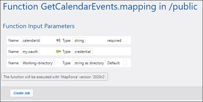1.Connectez-vous sur FlowForce Server et ouvrez GetCalendarEvents.mapping depuis le conteneur « public ». Dans FlowForce Server, les mappages déployés deviennent des fonctions, à savoir la terminologie utilisée sur l’interface ci-dessous. Veuillez noter que la fonction exige un identifiant en tant que paramètre d’entrée. Le nom de l’identifiant est le même que celui donné dans MapForce, à savoir « my.oauth ».