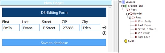 L'exemple de solution 04-EditRecords.mtd (design affiché dans la capture d'écran ci-dessous) affiche les données de BD dans la table et permet aux utilisateurs d'éditer les données. Les champs de la table sont liés à la source de page $PERSISTENT. Ceci signifie (i) que les contenus de $PERSISTENT sont affichés dans la table, et (ii) que les éditions que vous réalisez dans la table sont stockées dans $PERSISTENT.