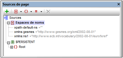 Les espaces de nom sont importants pour l'identification correcte des nœuds et pour la localisation correcte des nœuds avec l'utilisation des expressions XPath. L'élément Espaces de nom dans le Volet de sources de page (capture d'écran ci-dessous) contient tous les espaces de nom qui ont été déclarés pour le projet, quelle que soit la page active actuellement dans l'Affichage de la composition de page.