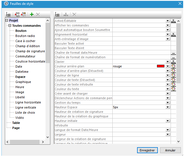 Le niveau Feuille de style contient toutes les propriétés du niveau Toutes commandes, plus les propriétés Table et Page (qui définissent, respectivement, les propriétés pour les tables et les pages). Si, donc, par exemple, vous définissez la propriété Couleur arrière-plan au niveau Feuille de style (avec par ex. une valeur red, comme dans la capture d'écran ci-dessous à gauche), tous les types de commande de niveau 3 auront une propriété Couleur arrière-plan, plus des tables dans le design, et la page de design héritera cette valeur (red dans ce cas) tant qu'aucune définition n'existe pour ces propriétés descendantes.