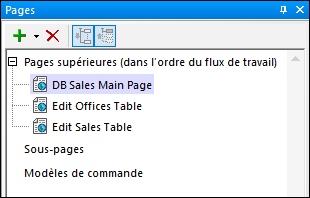 •Page principale Sales DB : Il s’agit de la page de démarrage. Elle affiche les données de BD et présentent deux boutons menant, respectivement, vers les deux autres pages de niveau supérieur.
