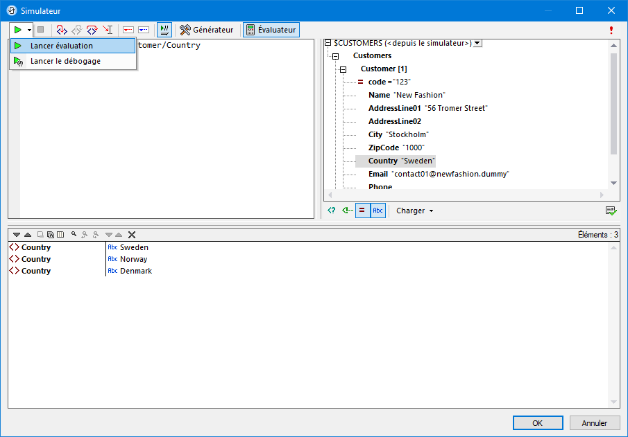 •Dans le Débogueur XPath, vous pouvez passer à travers l’évaluation d’une expression XPath pour voir comment l’expression est traitée. Vous pouvez ensuite modifier l’expression selon vos besoins. Pour sélectionner le Débogueur XPath : Cliquer sur Évaluateur dans la barre d’outils, puis sélectionner Lancer Débogage dans le menu déroulant de Lancer Évaluation/Débogage (voir capture d’écran ci-dessus). En alternative, il suffit de sélectionner Lancer Débogage.