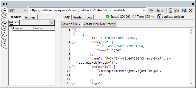 Dans XMLSpy, vous pouvez créer des demandes HTTP à partir d'un document OpenAPI. La procédure ci-dessous décrit comment procéder en créant une demande HTTP GET à partir d'un fichier de document OpenAPI et en soumettant la demande à un service web.