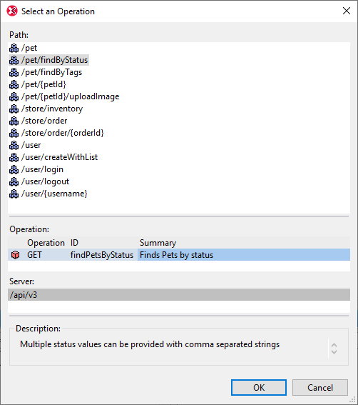 3.Dans le dialogue suivant, Sélectionner une opération, sélectionnez le chemin d'accès et l'opération souhaités. Par exemple, dans la capture d'écran ci-dessous, le chemin sélectionné est /pet/findByStatus et son opération GET est l'opération sélectionnée.