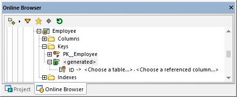 1.Dans le Navigateur en ligne, élargissez le dossier « Clés » de la table qui contient une clé étrangère existante.