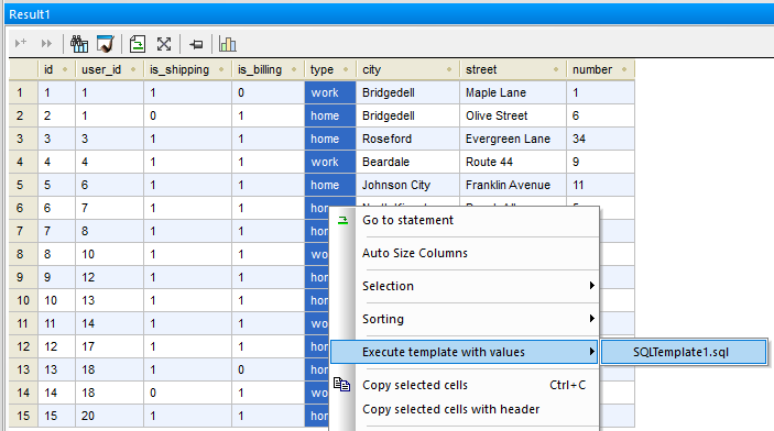 3.Cliquez de la touche de droite dans la sélection et choisissez Exécuter un modèle avec des valeurs | SQLTemplate1.sql.