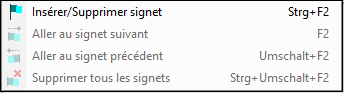 Le sous-menu Signets fournit des commandes pour insérer et supprimer les signets, et vous permet de naviguer entre les signets dans la fenêtre de l’Éditeur SQL.