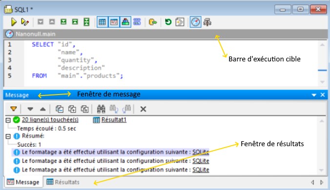 L’Éditeur SQL est l’espace où vous pouvez afficher, éditer et exécuter les instructions SQL. Il fournit une fenêtre de Message qui affiche le succès ou les messages d’erreurs et avertissements et une fenêtre de Résultat pour afficher les résultats de requête, le cas échéant.