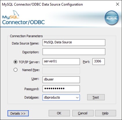 Cet exemple illustre comment se connecter à un serveur de base de données MySQL depuis une machine Windows par le biais du pilote ODBC. Le pilote ODBC MySQL n'est pas disponible sur Windows, il doit donc être téléchargé et installé séparément. Cet exemple utilise MySQL Connecteur/ODBC 8.0.