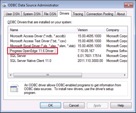 •Le pilote ODBC Connector for Progress OpenEdge doit être installé sur votre système d’exploitation. Le pilote Progress OpenEdge ODBC peut être téléchargé depuis le site web du vendeur (voir aussi Aperçu des pilotes de base de données). Veillez à télécharger le pilote 32-bit lorsque vous exécutez la version 32-bit de DatabaseSpy, et le pilote 64-bit lorsque vous exécutez la version 64-bit. Après l’installation, vérifiez si le pilote ODBC est disponible sur votre appareil (voir aussi Aperçu des pilotes ODBC disponibles).