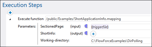 Une fois que le mappage a été déployé à FlowForce Server, le navigateur s'ouvre et charge la page de création de la tâche. Comme illustré ci-dessous, la première étape d'exécution est créée automatique et elle appelle la fonction de mappage déployée précédemment. Veuillez noter que le paramètre d'entrée porte le même nom que le composant de source MapForce (SectionedPage), alors que le paramètre de sortie porte le même nom que le composant de la cible (ShortInfo).