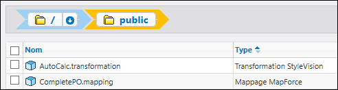 2.Dans FlowForce Server, se rendre dans le conteneur FlowForce dans lequel vous avez déployé la mappage ou la transformation (par exemple, le conteneur "/public"). Les mappages déployés ont une extension .mapping, tandis que les transformations déployées ont une extension .transformation (capture d’écran ci-dessous).
