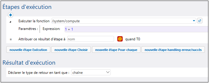 Pour mieux comprendre ce concept, créez une étape qui appelle la fonction builtin_function/system/compute et saisissez "1+1" dans le champ d’expression. Assurez-vous de déclarer le type de retour de la tâche sous la forme "string", comme ci-dessous.