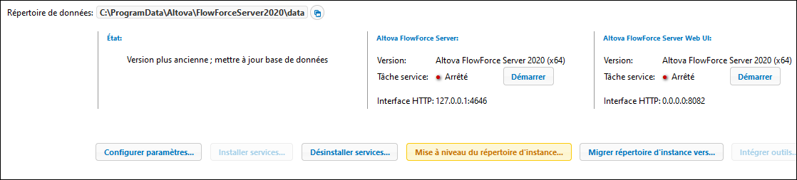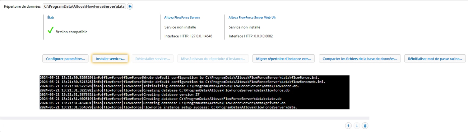 Dès que vous avez initialisé l’instance, l’état actuel, les activités journalisées et différentes options de configuration apparaîtront (capture d’écran ci-dessous). Le statut vous informera si la version de serveur est compatible ou non. Vous verrez également des informations si les services de FlowForce Server et FlowForce Web Server sont installés et exécutés.