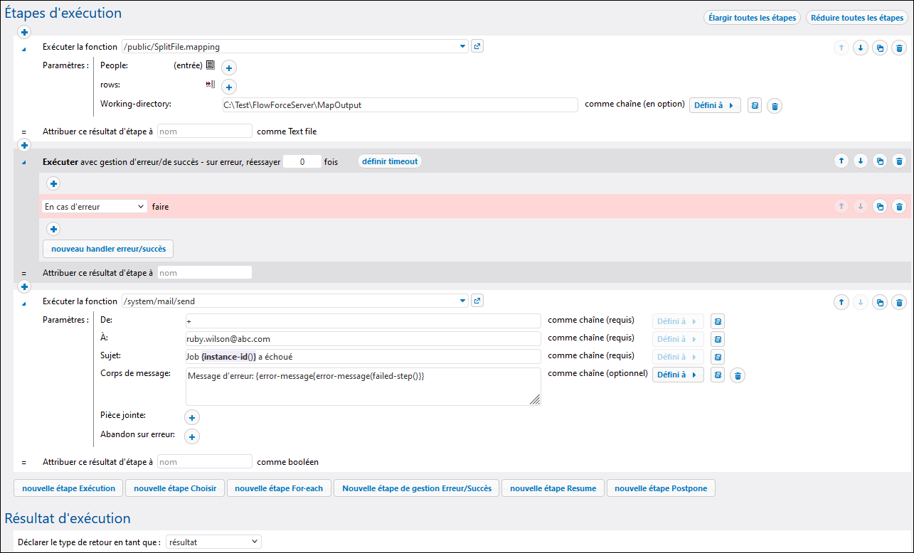 Cette tâche a un bloc de gestion Erreur/Succès qui exécute le mappage et copie les fichiers de sortie dans le chemin indiqué dans le champ Working Directory. Si l’exécution du mappage échoue, l’étape On-Error sera exécutée, par exemple, un e-mail contenant un message d’erreur sera envoyé au destinataire spécifié. Notez que pour être capable d’envoyer les e-mails, vous devez d’abord configurer les paramètres SMTP.