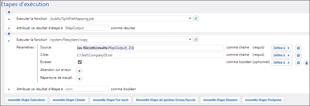 La fonction results convertit le résultat de l’étape de mappage à la liste des streams de résultat. La fonction nth prend la liste des streams comme son premier argument et sélectionne le troisième élément (la fonction nth est ‘zero-based’). La fonction as-file crée un fichier depuis le stream. Le fichier de sortie appelé Company03.txt sera enregistré dans le chemin spécifié dans le champ Cible. Si le fichier cible existe déjà, il sera écrasé.