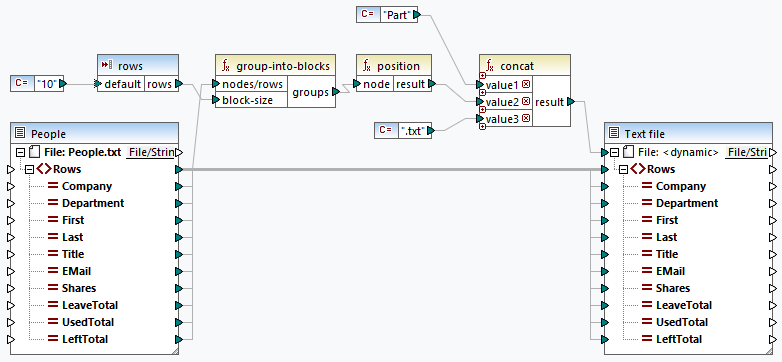 Pour pouvoir créer une tâche FlowForce qui exécute un mappage MapForce, nous devons d’abord déployer ce mappage dans FlowForce Server. Voir aussi le Mappage MapForce comme tutoriel de la tâche prévue pour plus de détails. Pour cet exemple, nous avons choisi le mappage suivant qui est envoyé ensemble avec MapForce : MapForceExamples\SplitFiles.mfd (capture d’écran ci-dessous). Ce mappage produit de multiples fichiers de sortie, dont les noms sont créés de manière dynamique, basés sur les paramètres fournis dans le mappage.