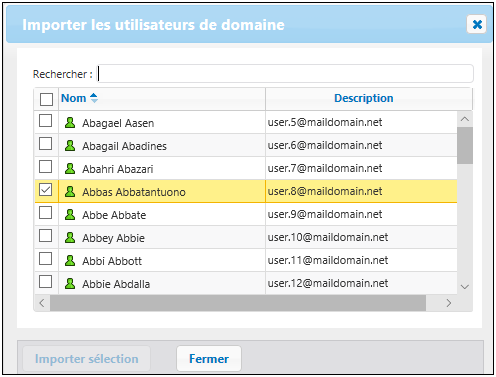 •Dans le dialogue Importer les utilisateurs de domaine, sous l'onglet Utilisateurs