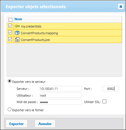 3.Dans le dialogue Exporter objets sélectionnés (capture d'écran ci-dessous), vous pouvez choisir d’exporter vos données de configuration vers une instance de FlowForce Server en cours d’exécution (Exporter au serveur) ou vers un fichier avec une extension .zip. Si vous sélectionnez l’option Exporter vers le serveur (rectangle rouge ci-dessous), vous devez saisir le nom d'hôte du FlowForce Server de destination, le port sur lequel il s'exécute, le nom d'utilisateur et le mot de passe de l'instance FlowForce Server de destination, puis cliquer sur Exporter.