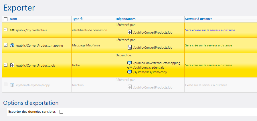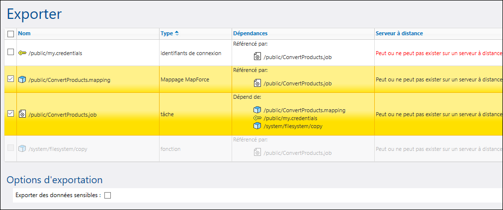 La colonne Serveur à distance indique si le fichier existe à la destination. Si les dépendances existent déjà à la destination, vous pouvez sans problème exclure de telles entrées de l’exportation. Dans le cas contraire, si vous exportez des enregistrements sans leurs dépendances et que ces dernières n'existent pas à la destination, ces tâches risquent d'échouer.
