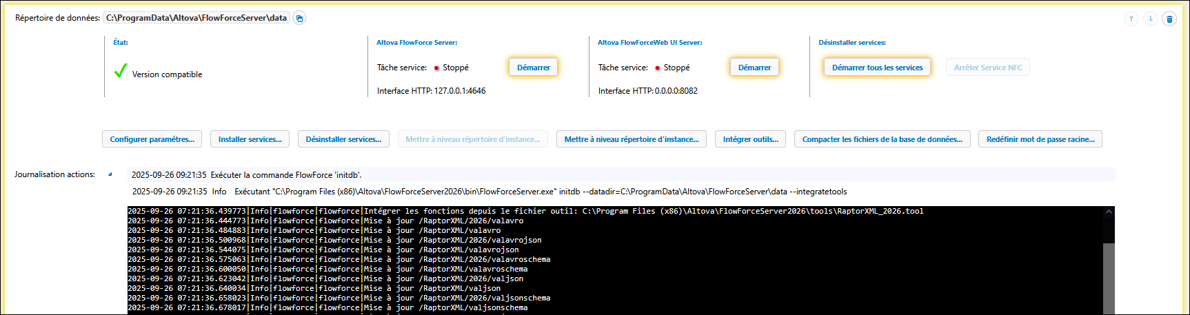 Si le script retourne des erreurs, les définitions de fonction de la version intégrée de RaptorXML ne sont pas compatibles avec FlowForce Server. Dans le cas improbable où cela se produirait, veuillez contacter le SAV.