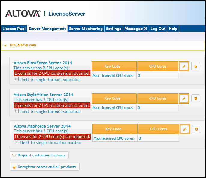 Si FlowForce Server a été installé avec d'autres produits de serveur Altova, l'enregistrement de FlowForce Server enregistrera aussi automatiquement les produits de serveur Altova. Une fois avoir enregistré FlowForce Server avec succès, vous pouvez vous rendre sur LicenseServer et attribuer une licence à FlowForce Server. La section Attribuer des licences aux produits enregistrés décrit comment attribuer des licences.