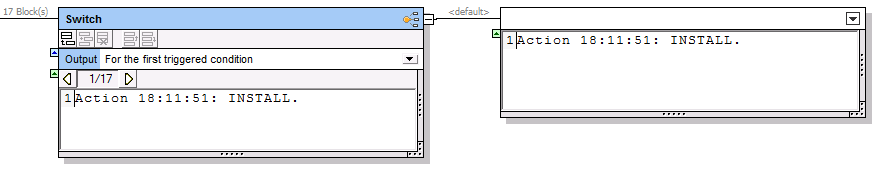 5.Cliquer sur le coin supérieur droit du nouveau conteneur de sortie et choisir Switch. À présent, FlexText traitera le contenu du conteneur en tant que switch. Comme indiqué ci-dessous, une condition switch <default> a été créée automatiquement — cette condition redirige vers un nouveau conteneur tous les textes qui ne correspondent pas à d’autres conditions. À ce niveau, aucune autre condition n’a été définie, c’est pourquoi tout le texte est actuellement redirigé vers la sortie <default>.