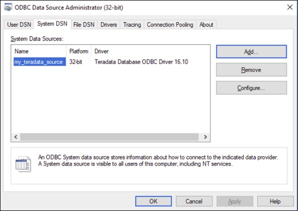 •Le pilote Teradata ODBC doit être installé (téléchargeable depuis le site web Teradata).