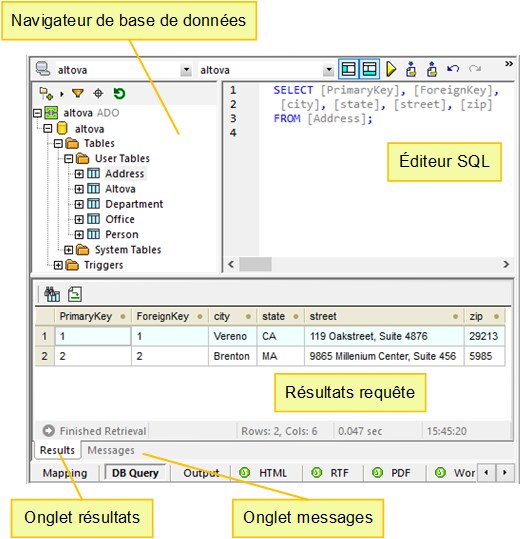 Le volet Requête BD vous permet de requêter directement toutes les bases de données principales. Vous pouvez travailler avec plusieurs connexions actives vers des bases de données différentes. Pour plus d'informations, voir Parcourir et interroger des bases de données.