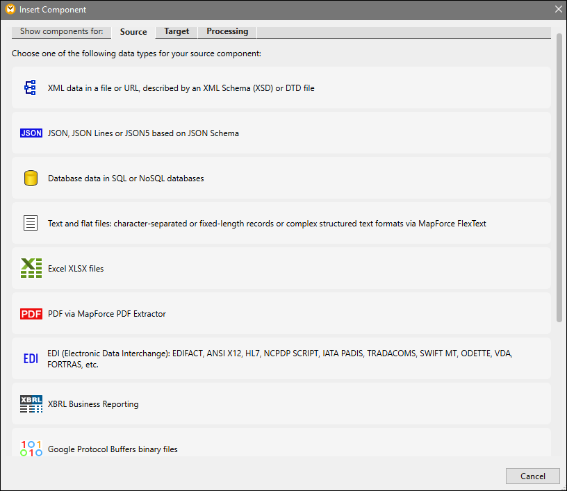 Chaque type de composant a un but et une fonction spécifiques. Pour obtenir une vue d'ensemble des composants, voir Composants. Pour en savoir plus sur les structures de données pouvant être utilisées comme sources et cibles, voir Composants de données. Vous pouvez ajouter un fichier local, un composant provenant d'une URL ou de la liste des ressources globales (voir les sous-sections ci-dessous). Pour plus d'informations sur les composants MapForce utilisés pour stocker temporairement ou transformer des données, voir Composants de traitement.