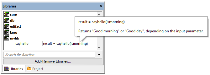 L'image ci-dessous montre à quoi pourrait ressembler un fichier .mff personnalisé après l'importation dans MapForce. Veuillez noter que la bibliothèque personnalisée mylib apparaît en tant qu'entrée de bibliothèque (triée par ordre alphabétique), contenant la fonction string sayhello.