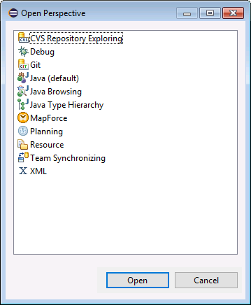 Lorsqu'un fichier dont le type de fichier est associé avec MapForce est ouvert (.mfd), ce fichier peut être édité dans la perspective MapForce. De même, un fichier d'un autre type de fichier peut être ouvert dans une autre perspective dans Eclipse. En outre, pour tout fichier actif, vous pouvez changer de perspective (voir ci-dessous), donc permettre d’éditer ou de traiter ce fichier dans un autre environnement.