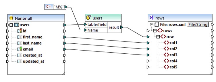 Le composant de constante %S fournit la valeur du paramètre param. Le caractère générique % dénote un nombre quelconque de caractères. Le mappage cherche donc un motif dans la colonne last_name (tous les noms de famille commençant par "M").
