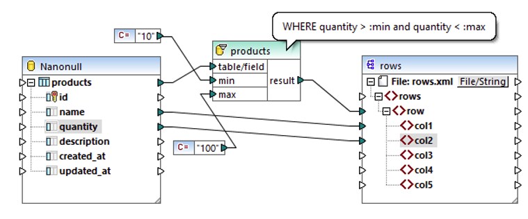 La condition WHERE suivante crée deux paramètres, min et max, auxquelles les valeurs actuelles de quantity sont comparées. Les valeurs min et max sont fournies par deux composants constants du mappage.