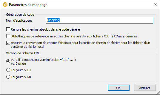 Cette option permet de définir la version de schéma XML utilisée dans le fichier de mappage. Veuillez noter que pas toutes les versions 1.1. spécifiques sont actuellement prises en charge. Si la déclaration xs:schema vc:minVersion="1.1" est présente, la version 1.1 sera utilisée ; sinon, la version 1.0 sera utilisée.