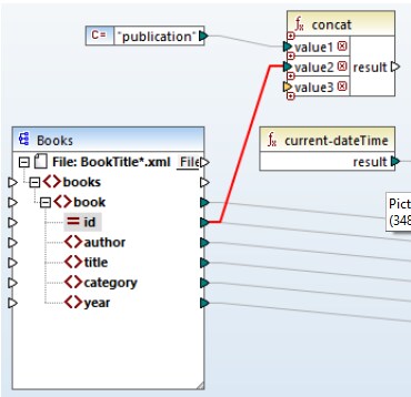Connectez l'attribut id du composant source avec value2 de la fonction concat (capture d’écran ci-dessous) L'attribut id du fichier XML source fournit une valeur d'identifiant unique pour chaque fichier. Cela sert à empêcher que les fichiers soient générés avec le même nom. La connexion devient rouge lorsque vous cliquez sur celle-ci.