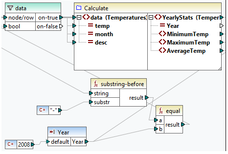 L’usage d’une séquence est illustrée dans le mappage suivant : MapForceExamples\InputIsSequence.mfd. Dans l’extrait de ce mappage (voir la capture d’écran ci-dessous), le filtre des données est connecté à la FDU appelée Calculer. La sortie du filtre est une séquence d’items. C’est la raison pour laquelle le paramètre d’entrée de la fonction est défini en tant que séquence.