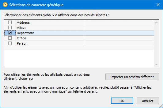 La boîte de dialogue sélections de caractère générique (voir ci-dessus) vous permet d’utiliser les éléments/attributs d’un schéma différent. Cliquer sur le bouton Importer un schéma différent vous donnera les options suivantes : (i) importer un fichier de schéma et (ii) générer un schéma wrapper (voir la description ci-dessous).