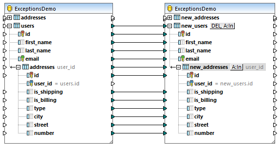 Vous pouvez trouver le mappage de démonstration référencé par cet exemple sous le chemin suivant : <Documents>\Altova\MapForce2023\MapForceExamples\Tutorial\DatabaseExceptions.mfd. Ce mappage insert les données depuis deux tables d’une base de données en une nouvelle paire de tables de la même base de données, il est décrit plus en détail dans l’exemple : Rollback de transaction. Veuillez noter que certains des enregistrements contenus dans la base de données sont délibérément null afin de générer des exceptions de base de données.