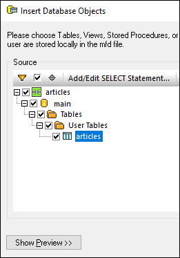 4.Cliquer sur Se connecter. Lorsque vous serez invité à choisir les objets de la base de données, choisir la table articles.