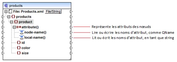 Comme indiqué dans la Fig. 4, cet item permet l'accès à tous les attributs du nœud, à l'exécution du mappage. Dans un composant de source, il fournit les attributs du nœud de source connecté, en tant que séquence. Par exemple, dans le XML suivant, la séquence contiendrait deux items (puisque product a deux attributs) :