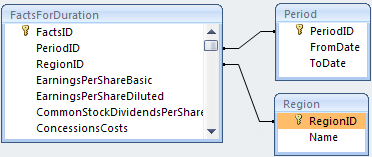 •La table FactsForDuration est hiérarchique et chaque fait qu'elle contient est lié à une PeriodID spécifique ainsi qu’une RegionID.