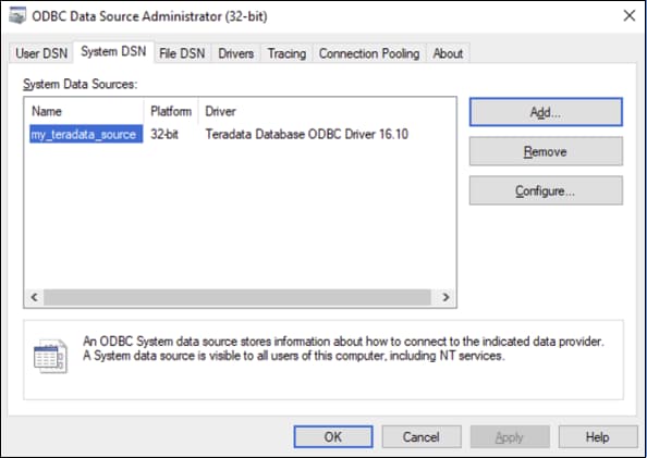 •Le pilote Teradata ODBC doit être installé (téléchargeable depuis le site web Teradata).