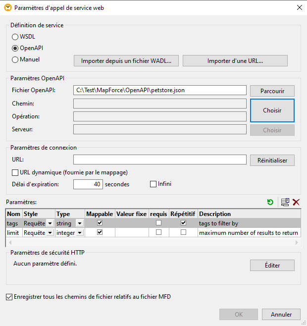 Les paramètres définis dans le fichier OpenAPI sont affichés dans la section Paramètres du dialogue Paramètres d’appel de service Web (capture d’écran ci-dessous). Pour chaque paramètre, vous devez définir si le paramètre est mappable ou s’il a une valeur fixée, mais vous ne devez pas modifier d’autre paramètres des paramètres OpenAPI définis, à l’exception s’ils sont incorrects.