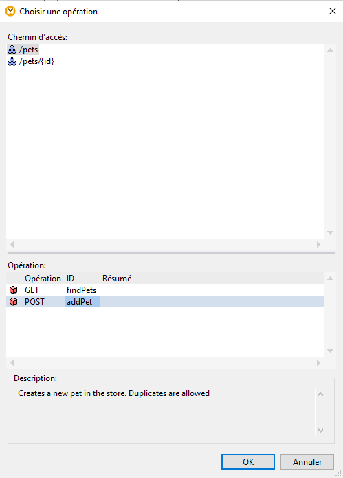 Le chemin et l’opération peuvent être configurés par le biais du même bouton Choisir. Lorsque vous cliquez sur ce bouton, un dialogue (capture d’écran ci-dessous) s’ouvrira et vous invitera à sélectionner un chemin et une opération pour celui-ci. Dans la capture d’écran ci-dessous, l’opération POST a été sélectionnée pour le chemin /pets. |
