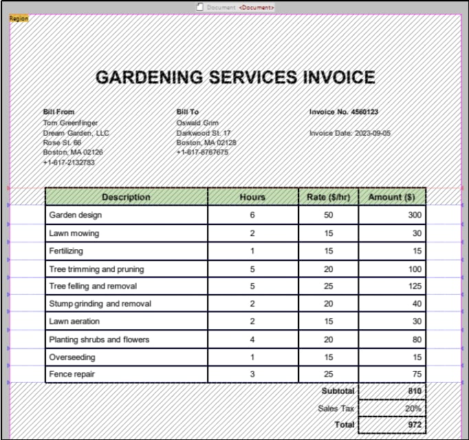 •Pour exclure la partie supérieure de la page (qui contient l’en-tête, l’entreprise, le client et les détails de la facture), la ligne de l’en-tête de la table, et la partie inférieure de la page du traitement