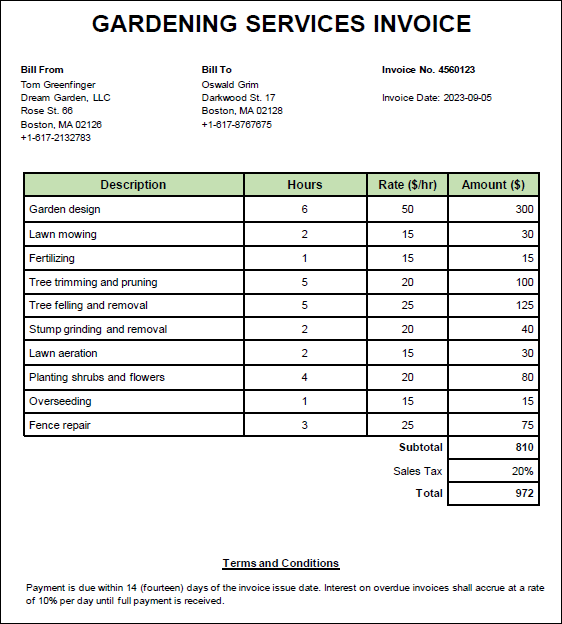 Le document PDF (capture d’écran ci-dessous) duquel nous voulons extraire les données est une facture simple qui contient un en-tête, des informations sur l’entreprise, le client et la facture, une table avec une description des services de jardinage fournis et des conditions. La facture est un document créé électroniquement qui ne contient qu'une seule page.
