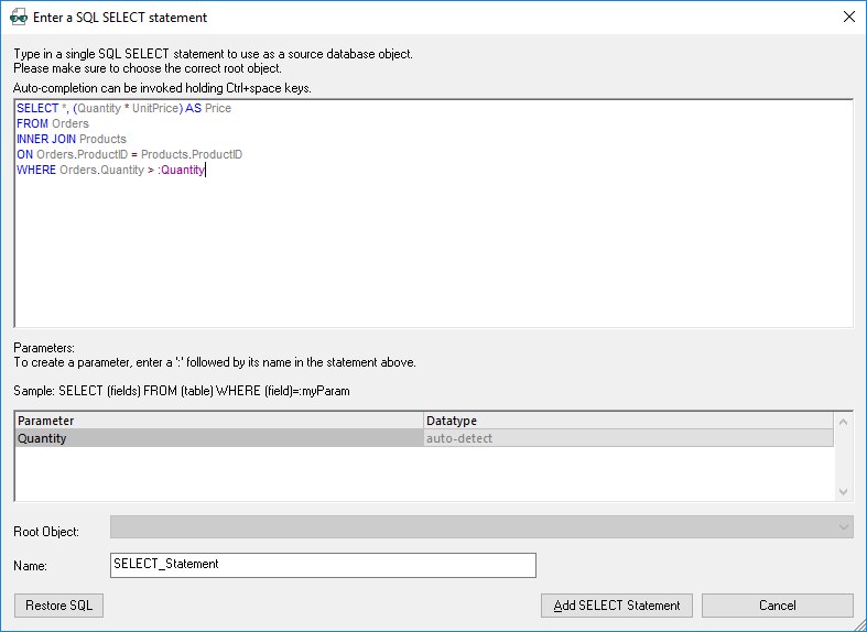 1.Nous souhaitons sélectionner à partir de la base de données uniquement les commandes dont le nombre d'objets commandés dépassent une valeur personnalisée. Cette valeur personnalisée doit être fournie en tant que paramètre dans le mappage. Pour atteindre cet objectif, nous allons créer une instruction SELECT de base de données personnalisée qui prend un paramètre d'entrée.