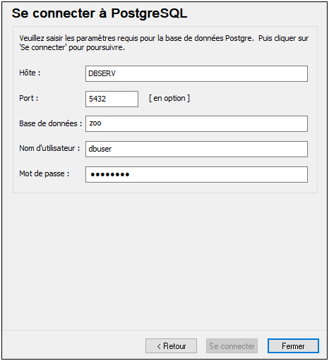 Sinon, si vous souhaitez configurer une connexion native à PostgreSQL, veuillez suivre les étapes suivantes. Avant de pouvoir continuer, il vous faudra les éléments suivants : nom d'hôte, port, nom de base de données, nom d'utilisateur et mot de passe.