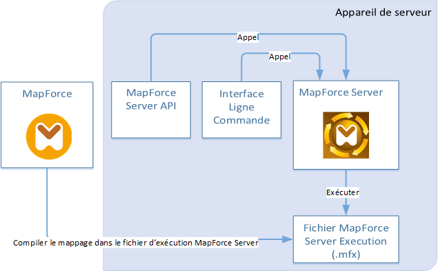 •Sur l'appareil Windows sur lequel MapForce est exécuté, compiler le mappage à un MapForce Server Execution File (.mfx). Les fichiers .mfx sont en fait des mappages de données emballés pour une exécution dans un environnement de serveur. Vous pouvez copier ces fichiers sur un des systèmes d'exploitation pris en charge où MapForce Server est exécuté (y compris sur les différentes plateformes, voir Exigences du système). Sur l'appareil de serveur, vous pouvez exécuter le fichier .mfx à l'aide de l'interface de ligne de commande proposé par MapForce Server, ou en utilisant l'API MapForce Server.